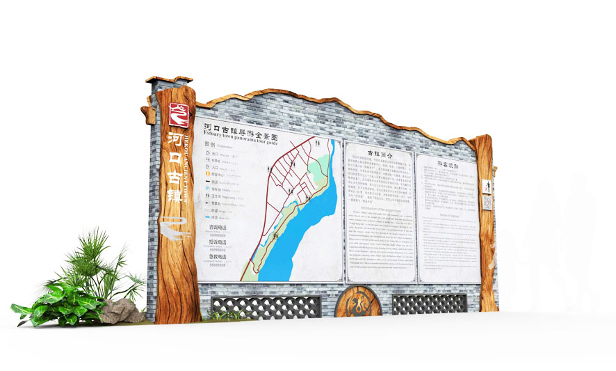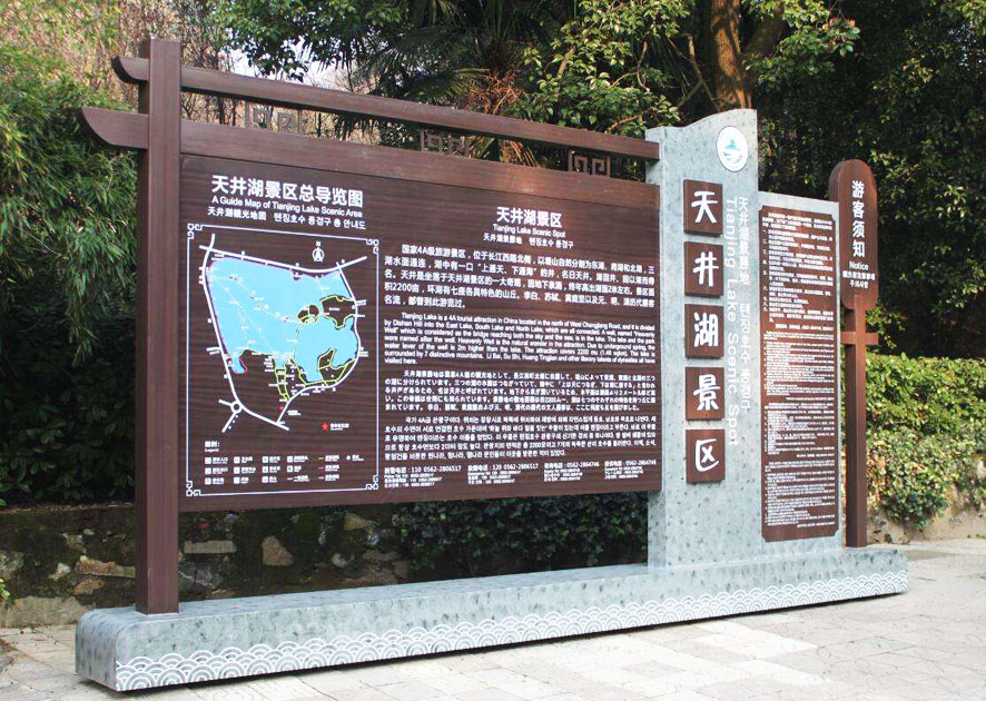 一個景點根據往往由不同的景觀構成,每個景觀都要使用到景觀介紹牌來進行講解說明,所以景觀介紹牌在設計時候,我們強調的是它的科學性,用通俗易懂的文字,根據游客們的特點加入國家文字突出的重點來講解景觀點。